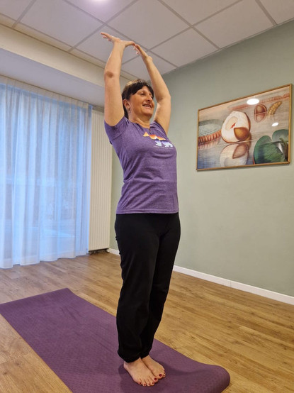 2. Sur une inspir levez les bras, écartez les mains, Inclinez le buste vers l’arrière, le poids du corps est sur l’avant des pieds, Regard vers le ciel.