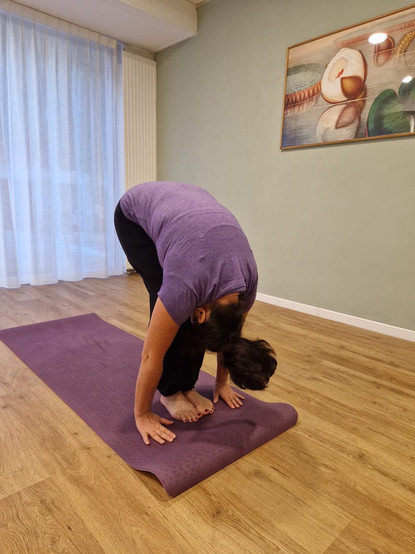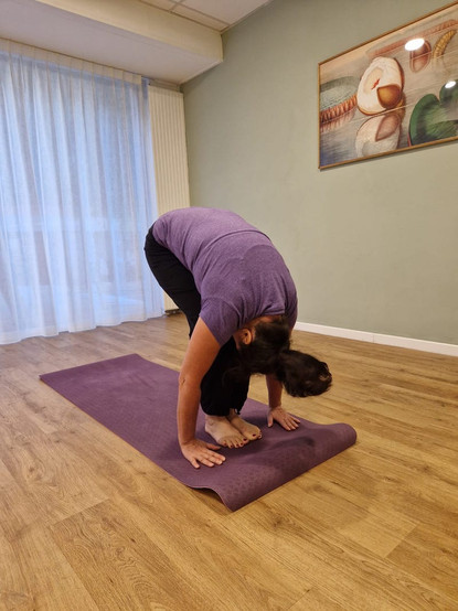 3.Descendez le buste vers l’avant bras tendus loin devant et venez poser les mains de chaque côté des pieds, pliez les genoux si nécessaire, la tête vers les genoux, expirez bien.
